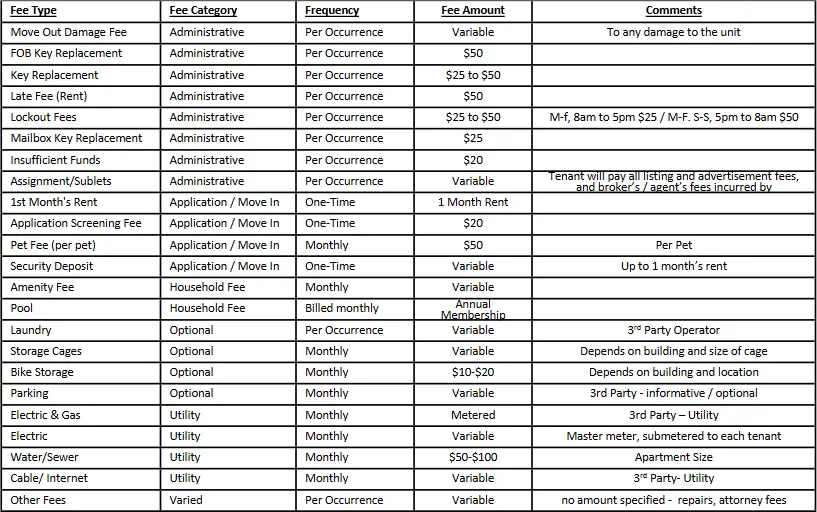 FEE DISCLOSURE: Please be further advised that tenants may incur fees and charges in connection with the rental of Landlord’s properties pursuant to the terms of the lease agreement, including, but not limited to, parking, amenities, late fees, pet fees, insufficient funds, window guards, and third-party utilities. Additional fees may include as follows: